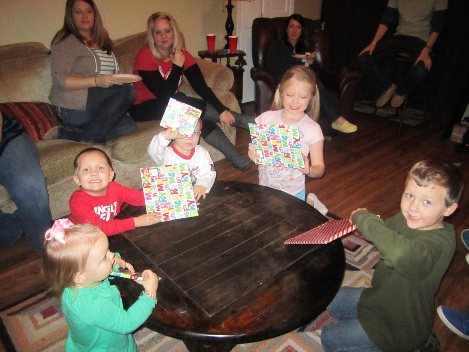 Since last year was such a hit we tried it again this year and extended the invitation to a few more friends. This year the Aylors, Crawfords, Cummings, and Butlers all came over and joined Cobb and I. All in all we had 10 adults, 3 teenagers, and 5 little kids. We ate pizza, taught the kids how to shoot marshmallows out of my new marshmallow shooter, and then the kids opened their Christmas books from me…which turned out to be a much bigger hit than I had anticipated. Usually they’re hoping for a really cool toy or something and are sometimes disappointed with a book…however I will not be swayed in my gift giving! This year they loved the books and actually sat around the table looking through their books for awhile.